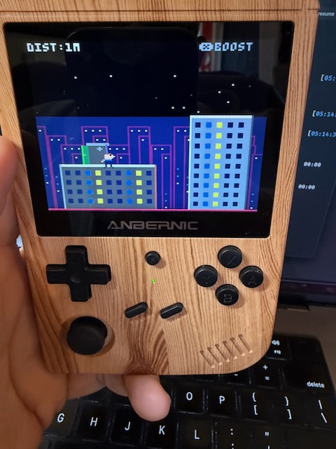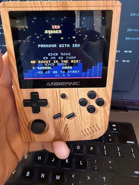 I posted yesterday about IBS Runner, and gave a link to play it in your browser. But you can also play it on macOS/Windows/Linux, and handheld devices, like my Anbernic RG 351V with the sweet, sweet bamboo trim.